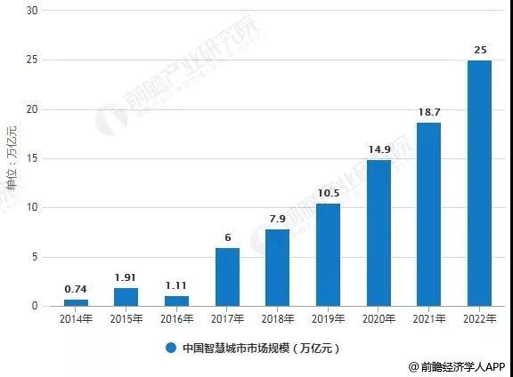 據前瞻產業研究院發布的《中國智慧城市建設發展前景與投資預測分析報告》統計數據顯示,2014年中國智慧城市市場規模僅僅為0.76萬億元。到了2016年中國智慧城市市場規模突破1萬億元。截止到2017年中國智慧城市市場規模增長至6萬億元。預計2018年中國智慧城市市場規模將接近8萬億元,達到7.9億元。2019年時中國智慧城市市場規模將突破10萬億元。未來五年(2018-2022)年均復合增長率約為33.38%,并預測到了2022年中國智慧城市市場規模將達到25萬億元。