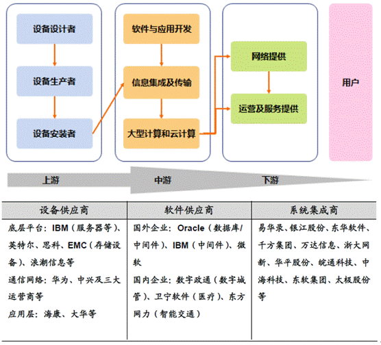 智慧城市是我國新型城鎮化發展的必然選擇,其建設是一項非常龐大的系統工程,產業鏈中存在大量上下游關系。粗略理解,我們通過智慧城市涉及的感知、傳輸、計算、決策等環節,將智慧城市產業鏈劃分為硬件設備制造、軟件和信息服務、系統集成、運營服務等細分領域及相關參與者: